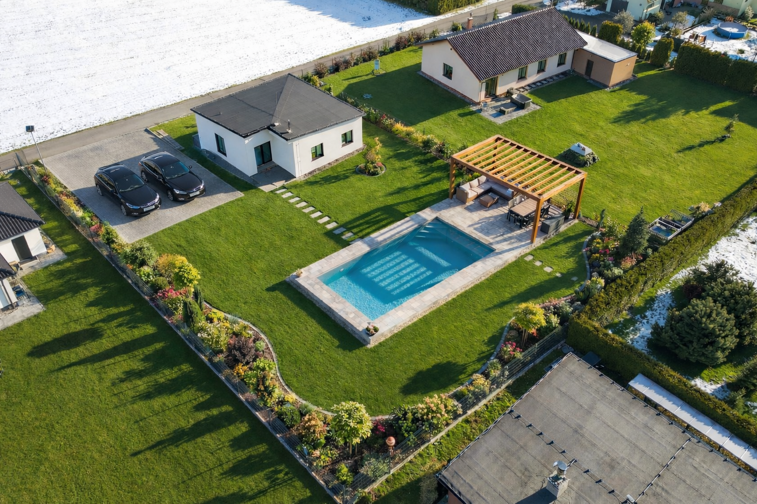 Zastavěná plocha domu činí 130 m² a je umístěn na pozemku o celkové výměře 1 542 m², který poskytuje dostatek prostoru pro zahradu, terasu i další venkovní využití.