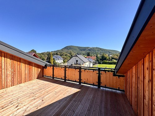 V domě budou provedeny 2 terasy, a to dolní dřevěná na terčích o ploše 10 m2 a horní, náležící k místnosti ve 3.NP (s výhledem na Javorník) z betonové dlažby / dřevěných prken na terčích. Zábradlí bude v kombinaci černých ocelových sloupků a výplně z kvalitní exteriérové biodesky.