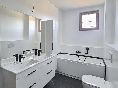 Uvnitř domu je uvažováno s vytápěním pomocí tepelného čerpadla a podlahového vytápění. Sociální zařízení obsahují keramický obklad a běžné zařizovací předměty. Na ostatních podlahových plochách je uvažován vinyl. Pro zájemce, kteří si chtějí interiér dotvořit po své linii, nabízíme prodej domu za sníženou cenu ve variantě Shell & Core.